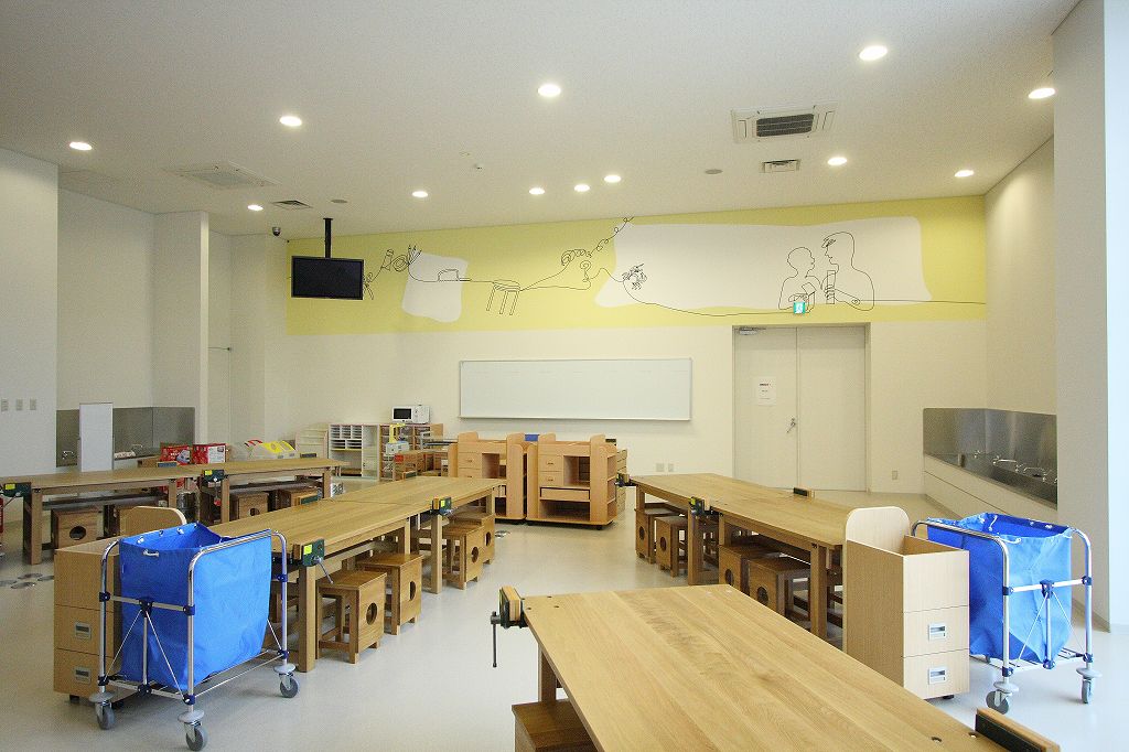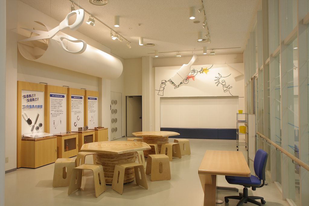 工作や絵画等の創作活動を通して、子どもたちが何かをつくることを楽しみながら創作力・創造性を高めることができます。一度に40人の子どもや親子が、身近なものを材料にしたものづくりを体験できます。
